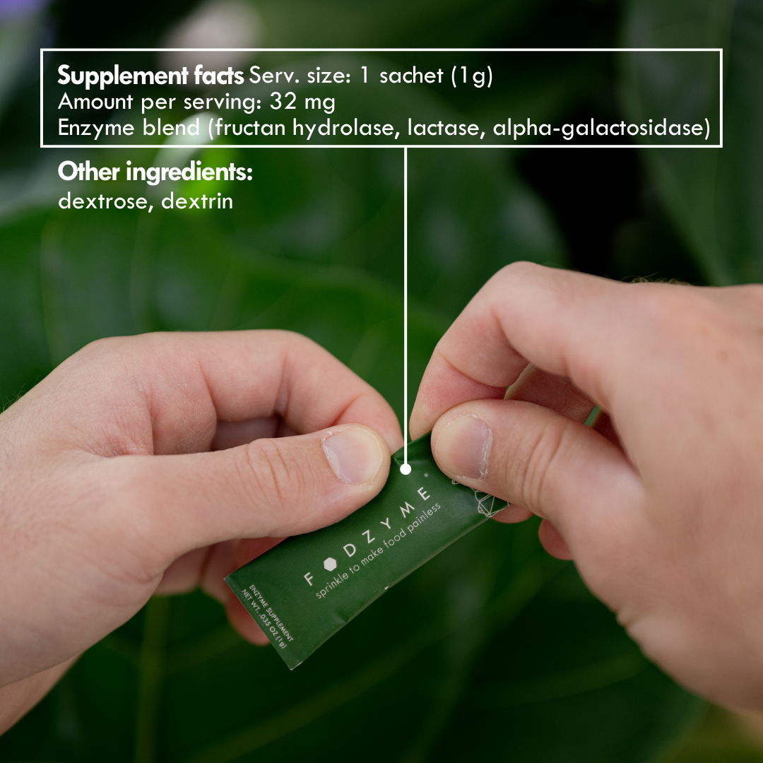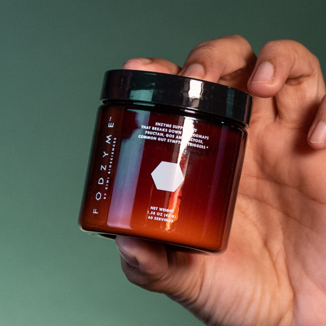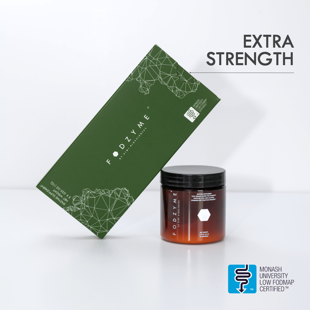 FODZYME®is a tasteless enzyme powder designed to break down FODMAPs (fructan, GOS, and lactose) in food to make meals more digestible. It's formulated specifically for people with FODMAP sensitivities.